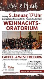 Mit festlichem Glanz, strahlenden Trompeten und jubelnden Pauken erklingt am Sonntag, 4. Januar 2026 (17 Uhr) das Weihnachtsoratorium von Johann Sebastian Bach in der Friedenskirche Neuried-Altenheim. Es musizieren Natalia Ortega Martí (Sopran) und Francesc Ortega Martí (Bass), begleitet von einem Orchester in historischer Formation unter der Leitung des Konzertmeisters Gottfried von der Goltz, einem der beiden musikalischen Leiter des bekannten Freiburger Barock-Orchesters. Es singt der Chor Cappella West Freiburg. Die musikalische Gesamtleitung liegt bei der Freiburger Kantorin Laura Škarnulytė. Die Texte und geistlichen Impulse gestaltet Pfarrer Gerald Koch aus Altenheim.